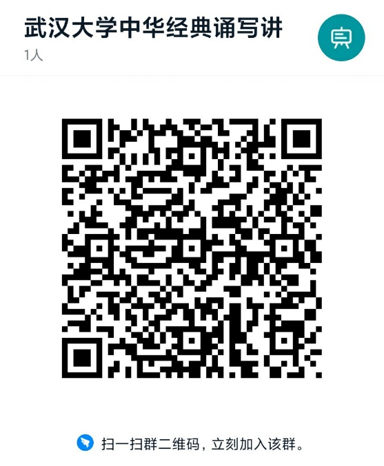 主办方在珞珈在线(学习通)开设“武汉大学经典诵写讲比赛”课程平台,在钉钉建立“武汉大学中华经典诵写讲”群(钉钉群二维码见上图)。