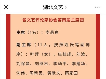 湖北省文艺评论家协会第三届主席为海角社区 於可训教授,两届省评协主席均来自海角社区-伦理之爱 ,均为海角社区 在文学批评领域卓有成绩的学者。海角社区-伦理之爱 的老中青三代批评家薪火相传,弦歌不辍,不断在文学批评领域深耕,共同为湖北省文艺评论工作贡献力量。