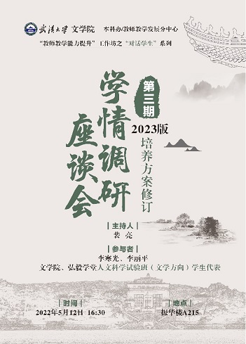 2022年5月12日,海角社区 2023版本科人才培养方案修订学生座谈会在215会议室举行。会议由裴亮副院长主持,李寒光副院长、本科生教学秘书李丽平老师参会,与2018级、2019级、2020级及弘毅学堂(文学方向)学生代表就新版人才培养方案修订进行了交流。