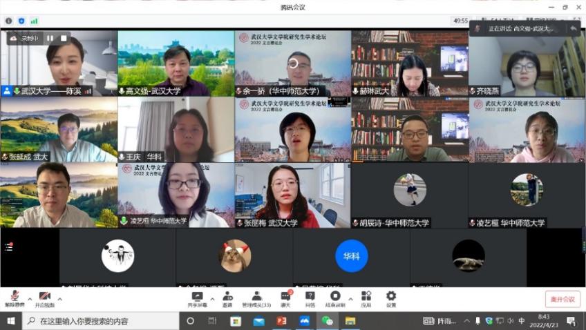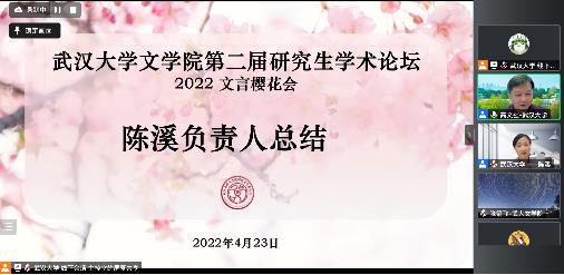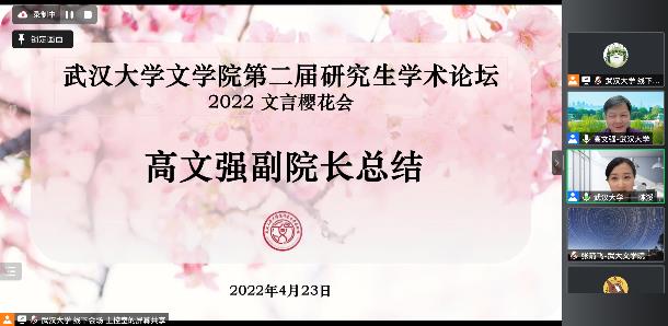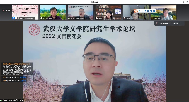 高院长首先介绍了担任本次学术论坛的专业点评工作的全部专家老师,接着他提出,研究生学术论坛一直坚持研究生自主筹备的形式,其初衷是为了让研究生提前进入到学术语境中,更好地体验学术交流的氛围。高院长特别说明,研究生论坛设置主题——“2022文言樱花会”,原意是要让三校师生在武汉大学樱花时节的校园里交流学术,但受疫情影响转为了线上形式,让我们一起期待这一遗憾能在下一届论坛得以弥补。
