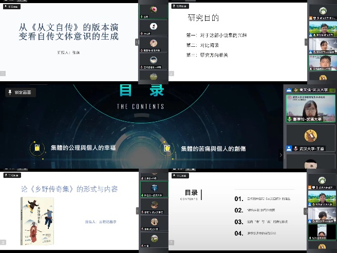 下午“文本解读与文学形式”部分,华中科技大学的王特尼格尔分析了《乡野传奇集》的形式和内容,认为随意言谈的形式与充满传奇色彩的故事使对传奇文体的利用恰到好处,达到了形式与内容的统一。武汉大学的叶立文老师肯定了该文的选题,同时从个案文学批评转向深广的学术史研究、关注作者意图与文本意图两方面提出了建议。武汉大学的张琪通过追溯《从文自传》的产生与修改,发现对客观真实的记录、对诗性表达的追求与对现实目的的考量,构成了该自传写作与修改过程中的“不可能三角”。华中科技大学的王庆老师肯定了选题和文献工作,但也提出了论文在观点明晰性,核心突出性,和论文总结范围的全面性方面的不足。华中师范大学的刘家言在拉康“三界”理论的框架下运用镜像阶段理论分析了《双城记》中卡尔登与代尔那的人物主体关系。武汉大学的张箭飞老师认为本文问题意识敏锐,研究方向在国内相关研究中较新颖,建议再多关注国际学术界的相关研究,以及“替身现象”在西方文学史中的呈现,将文本的理论批评更多地放诸于文学史传统的语境中。武汉大学的郑翠怡从“集体的公理与个人的幸福”、“集体的痛苦与个人的创伤”和“集体的追求与个人的幸福”三方面分析了元宇宙小说《骰子》中集体与个人的伦理学矛盾。华中师范大学的杜娟老师肯定了本研究的前沿性,同时建议可以关注文本的特异性和小说的审美形式,并结合作家身份分析其创作。