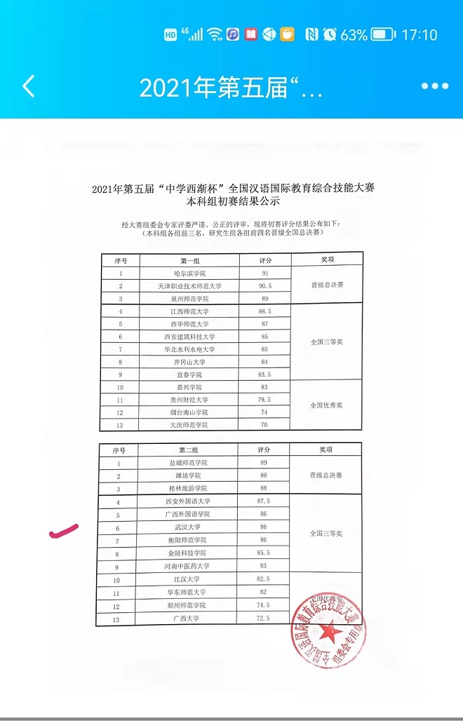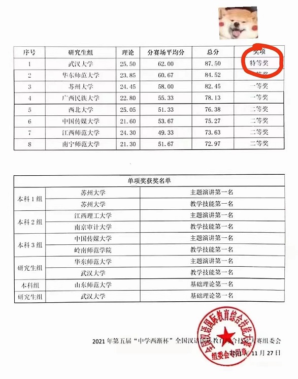 11月27日,第五届“中学西渐杯”全国汉语国际教育综合技能大赛决赛落下帷幕。在欧阳晓芳老师指导下,海角社区 汉语国际教育专业2020级硕士汪一帆、2021级硕士许冰蕊和原可馨三位同学通过层层选拔,代表武汉大学突围全国决赛,从来自全国的130支参赛队伍中脱颖而出,斩获研究生组特等奖、教学技能单项奖第一名及基础理论单项奖第一名。汉语国际教育专业2019级本科生李俊慧、马瑞林、刘羽茜三位同学也凭借优异表现,在本科生组的比赛中荣获全国三等奖。