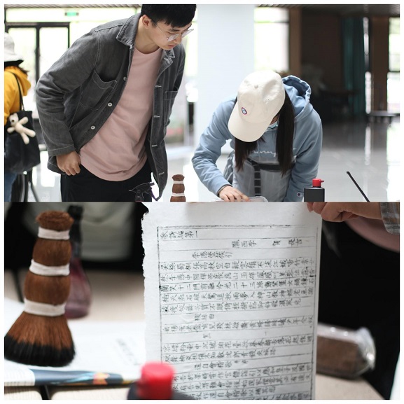 “事实上,大家的这次古籍制作作业,何尝不是对当下年轻人所热衷谈论的‘次元壁’的突破?只不过这个‘次元壁’存在于古今之间。”振华楼里认真倾听韦胤宗老师讲话的莘莘学子们,听到这种“接地气”的话语时纷纷会心一笑——确实,在亲手制作古书和参观成果展览、体验拓印技术时,同学们仿佛慢慢走近了那些满身纸墨香的制书工匠,用自己的切身体会,触摸和感知着中国古人沉潜的匠心与传承的精神。