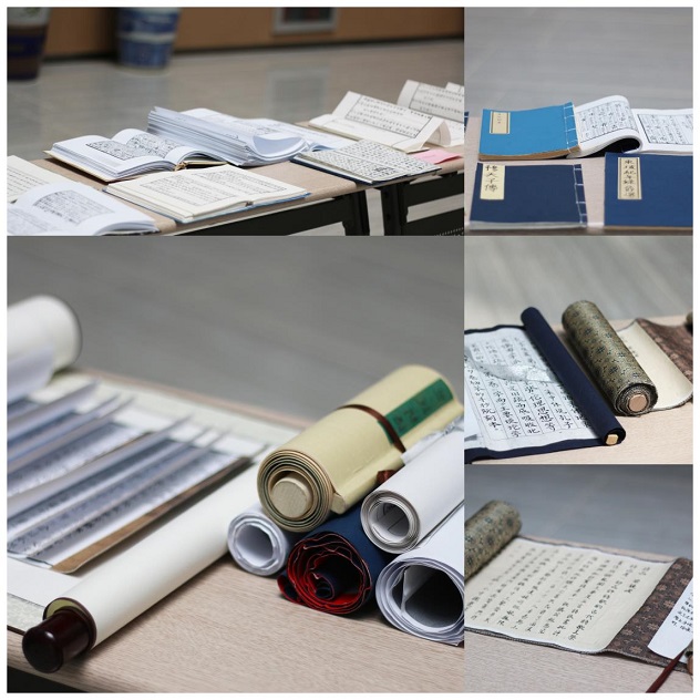 当天下午,2019级汉语言文学专业学生的作品集体亮相,卷轴装、经折装、蝴蝶装、包背装、线装……各种形制的古书整齐陈列在大厅周围,书籍内容的类别涉及经史子集四部,每种书前还有同学们自己撰写的解题,真可谓琳琅满目,场面十分壮观。整个展览期间,不断有院内院外的师生前来观看,驻足之际,赞叹不己,甚至有很多老师专程带孩子来感受传统文化的魅力。