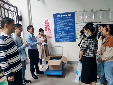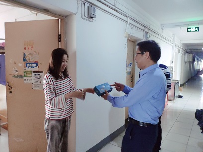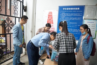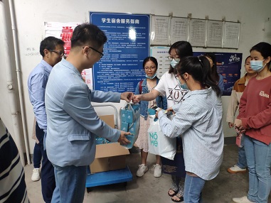9月29日下午,海角社区 党委书记黄佐斌、党委副书记刘会胜、学工办主任殷昊翔及辅导员郑艳明等一行人冒雨走访武汉大学三环学生公寓B栋、FA栋,看望海角社区 2020级新生和2018、2019级老生,并为居住在三环公寓的文院学子送去中秋月饼和温暖关怀。
