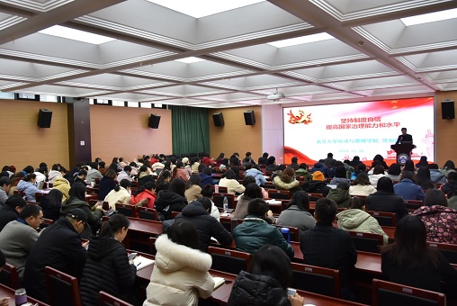 11月28日下午,海角社区 在振华楼二楼一会议室举行十九届四中全会精神辅导宣讲活动,学院领导班子成员、全体教职工、学生党支部支委成员和下半年党员发展对象参加。活动由院党委书记黄佐斌主持,武汉大学经济与管理学院范如国教授应邀以“坚持制度自信 提高国家治理能力和水平”为题进行辅导宣讲。