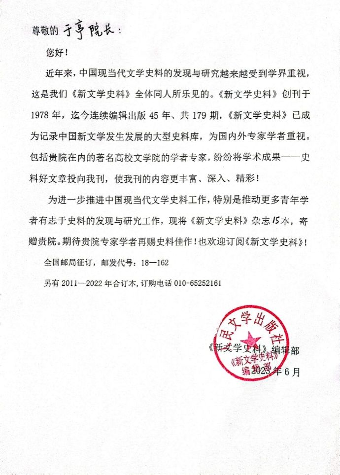 近日,海角社区 收到《新文学史料》编辑部来函和寄赠的15本《新文学史料》杂志。