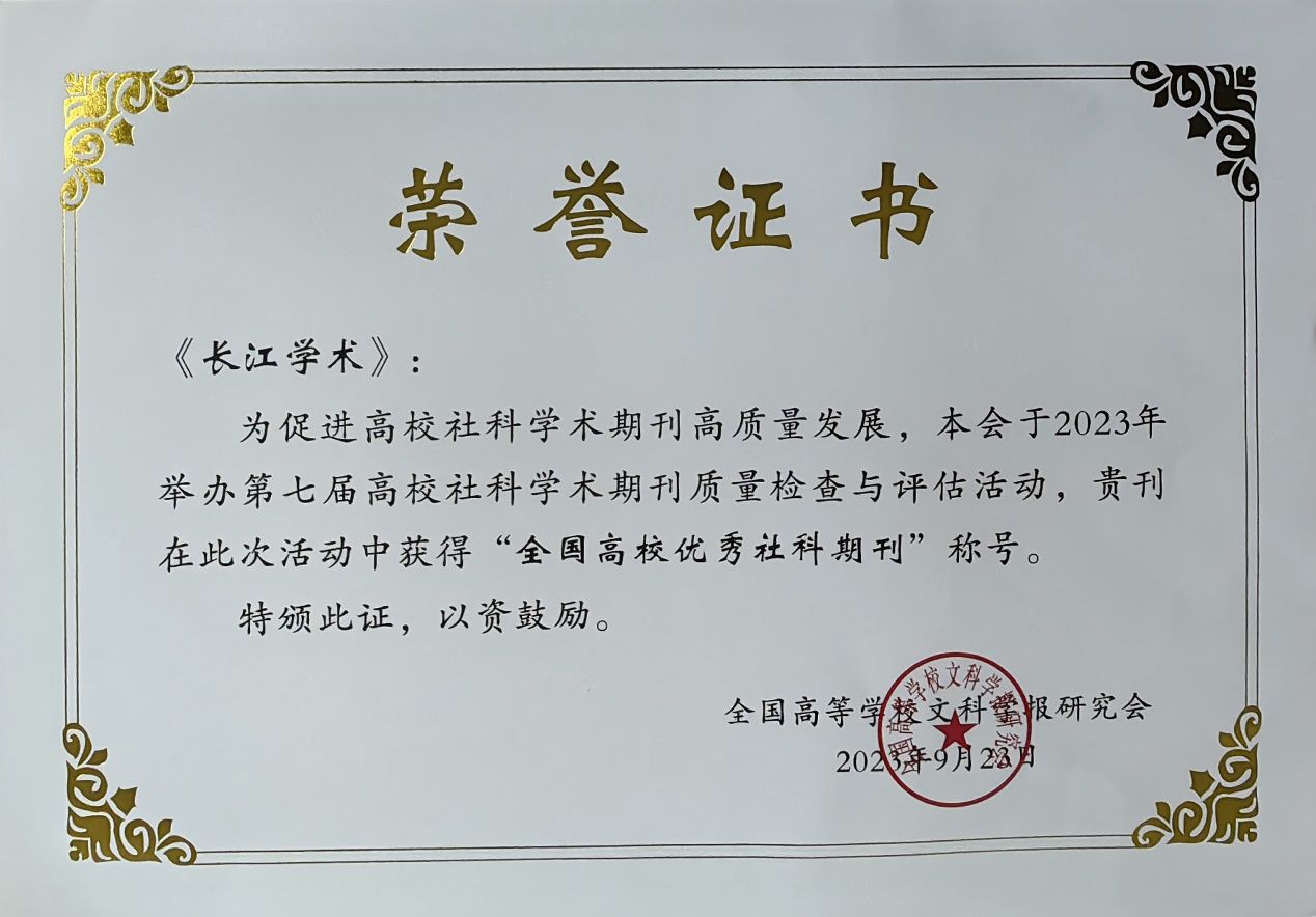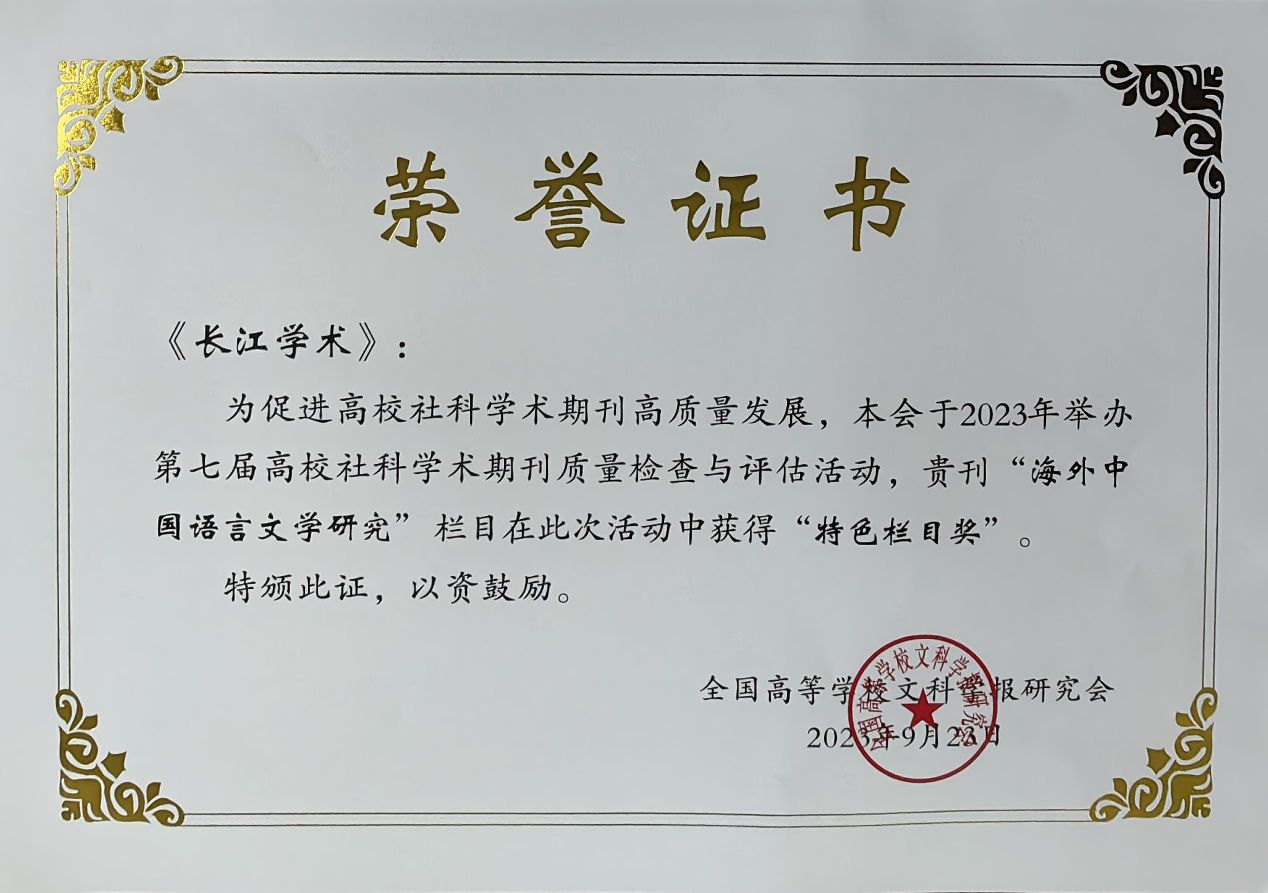 为促进高校社科学术期刊高质量发展,全国高等学较文科学报研究会2023年举办了第七届高校社科学术期刊质量检查与评估活动,《长江学术》获得“全国高校优秀社科期刊”称号,“海外中国语言文学研究”栏目获得“特色栏目奖”。