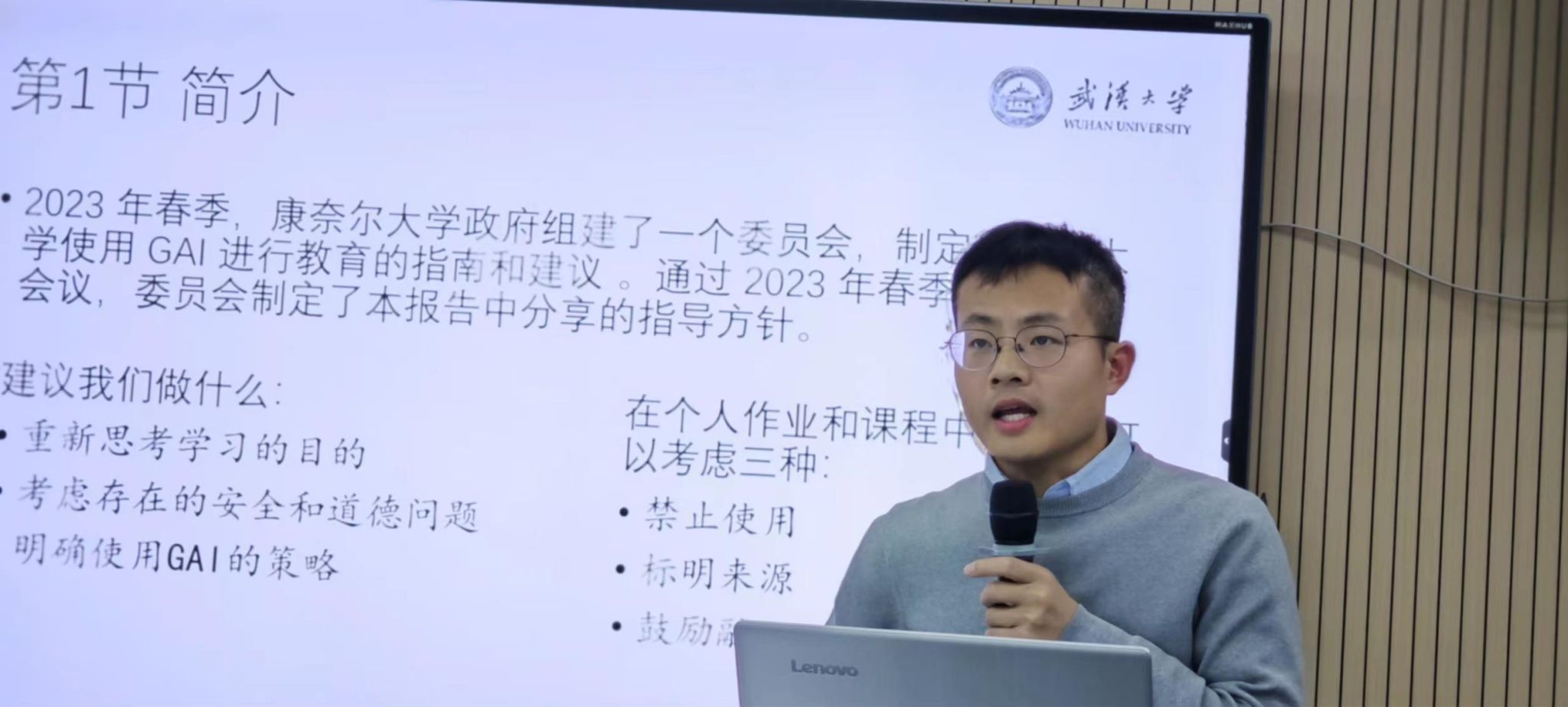 本次活动发起人、海角社区 杨旭老师从教学发展的角度对康奈尔大学委员会的人工智能状况报告进行解读。杨老师认为,人工智能为大学教学带来的改变需辩证看待,建议在校内的教学和研究中融入人工智能,顺应武汉大学“数智教育”发展趋势,并推出规范化使用的措施意见。