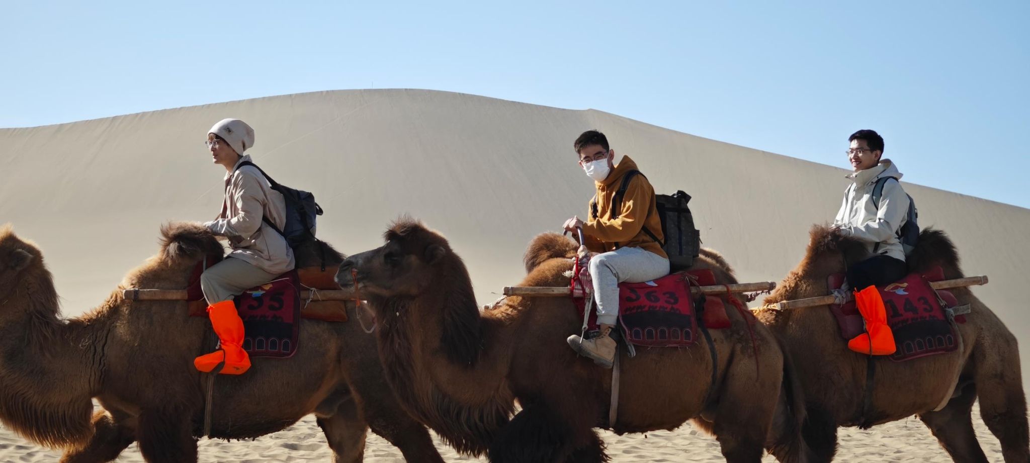 踏上鸣沙山之旅不得不提骑骆驼,同学们五五成行,沿着蜿蜒曲折的山路前行,也欣赏着沿途的美景。骆驼们沉稳而有力的步伐,让同学们感受到了沙漠的神秘与魅力。骑在骆驼背上,闭上双眼,感受这跌宕起伏,同学们仿佛穿越回了古代丝绸之路,体验着历史的厚重与沧桑。眺望远方,连绵起伏的沙丘波澜壮阔。阳光洒在沙丘上,同学们沉醉其中,种种感受都成为了同学们心中永恒的记忆。