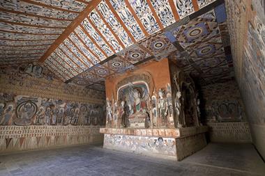 世界遗产委员会评价道:“莫高窟地处丝绸之路的一个战略要点。它不仅是东西方贸易的中转站,同时也是宗教、文化和知识的交汇处。”莫高窟又名“千佛洞”,位于中国西部甘肃省敦煌市东南25公里处鸣沙山的崖壁上。莫高窟最初开凿于前秦建元二年(公元366年),至元代(公元12711368年)基本结束,经过连续近千年的不断开凿,使莫高窟成为集各时期建筑、石刻、壁画、彩塑艺术为一体,世界上规模最庞大,内容最丰富,历史最悠久的佛教艺术宝库。现石窟南北长1600余米,上下共五层,最高处达50米。现存洞窟492个,壁画45000余平方米,彩塑2415身,飞天塑像4000余身。