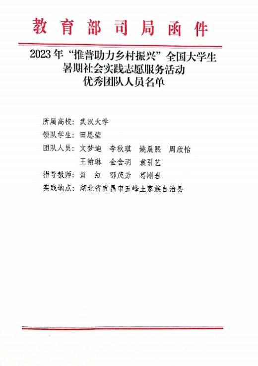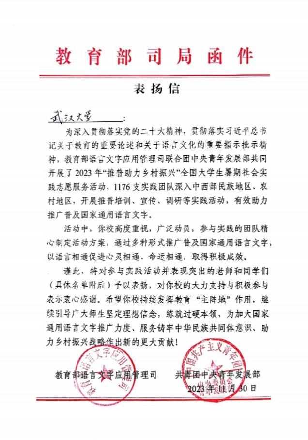 近日,2023年“推普助力乡村振兴”全国大学生暑期社会实践志愿服务活动评优结果公布,海角社区 “武大学子五峰推普行”社会实践团队荣获“优秀团队”称号。教育部语言文字应用管理司、共青团中央青年发展部专门给武汉大学发来表扬信,对海角社区 师生团队在服务国家通用语言文字推广、服务铸牢中华民族共同体意识、助力乡村振兴战略中作出的贡献给予充分肯定。