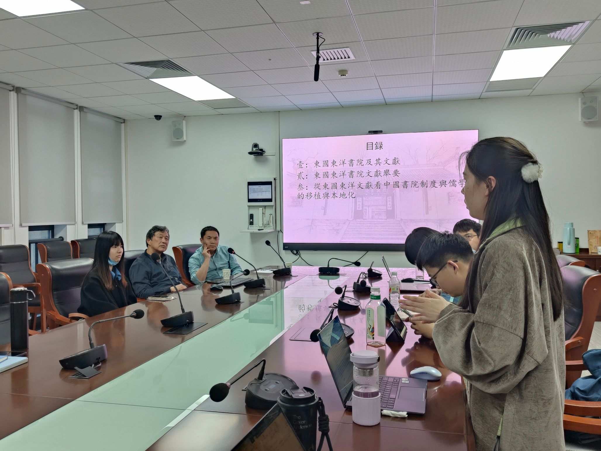 其后,邓教授从朝鲜第一部书院志《竹溪志》切入,先后讲解《迎凤志》《吴山志》《书院誊录》及朝鲜光复后书院志的构成和内容,重现了朝鲜建设书院时回应质疑、创建发展、本土内化的历史进程。日本的《日本顺正书院记并诗》是该国惟一的一本书院志,其中有关书院命名阐释、探讨儒学流派、论析东西学术等内容,对于研究江户末期日本儒学具有重要价值。《白鹿洞书院揭示说》亦体现了日本儒学家对中国儒学的吸收、思考和利用。